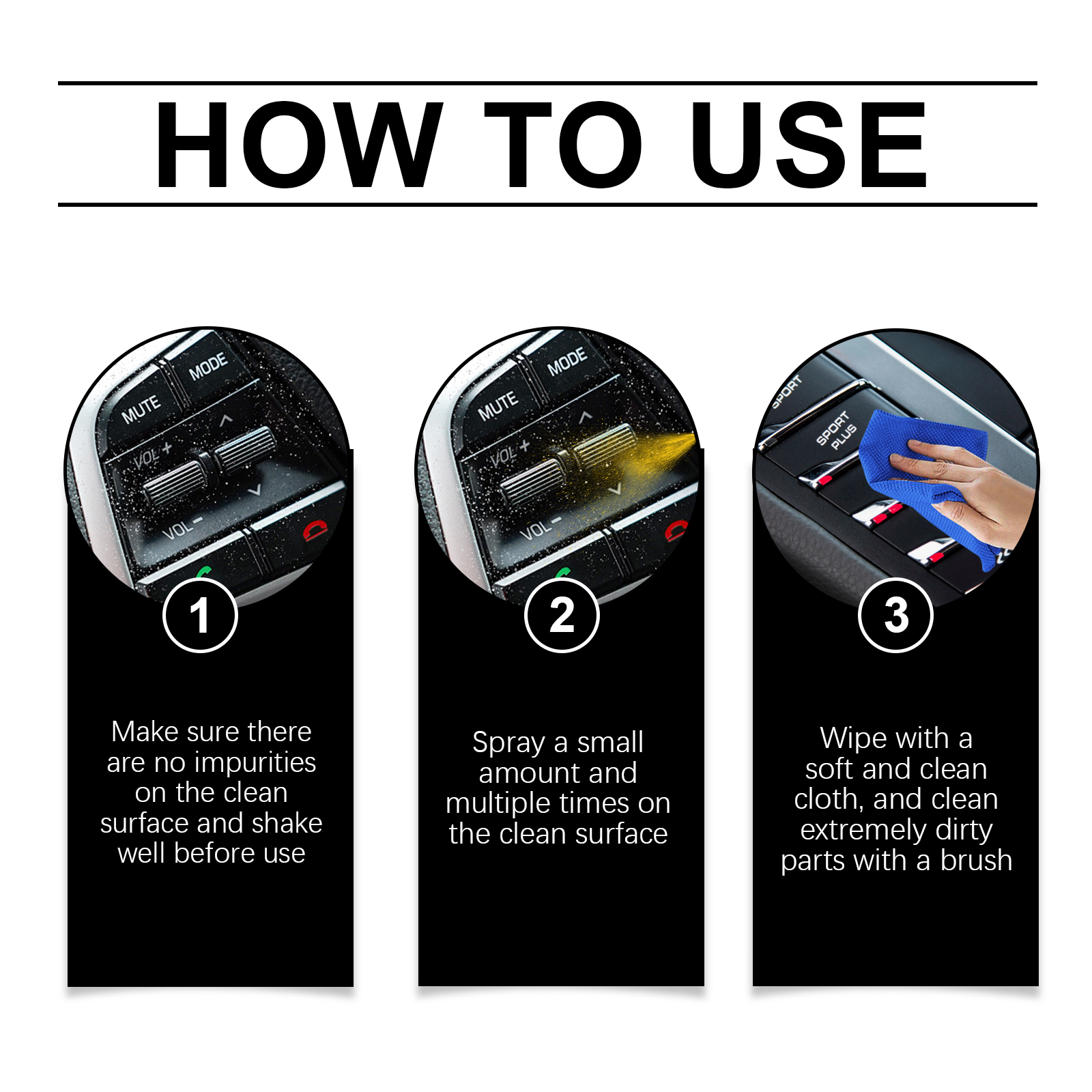 Our versatile interior cleaners contain palm kernel oil amide DEA and sodium laureth sulfate. It can efficiently remove stubborn stains inside and outside the car, and keep the car bright and clean. Improve in-car air quality for a refreshing driving experience. Its use is very simple: before use, please ensure that the clean surface is free of impurities, and shake well, spray a small amount of times on the clean surface, wipe with a soft and clean cloth, and clean the extremely dirty parts with a brush. And can be applied to the inside, outside and under the car cleaning, fully protect the vehicle.