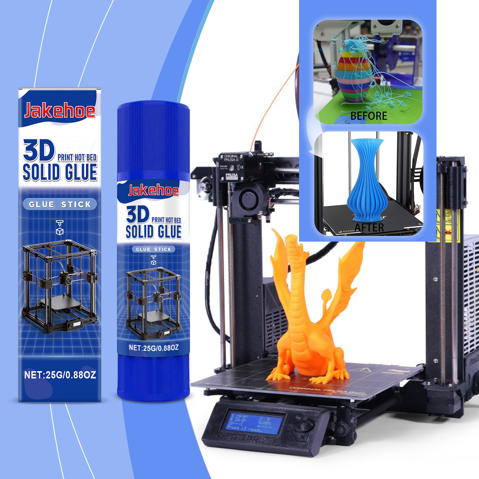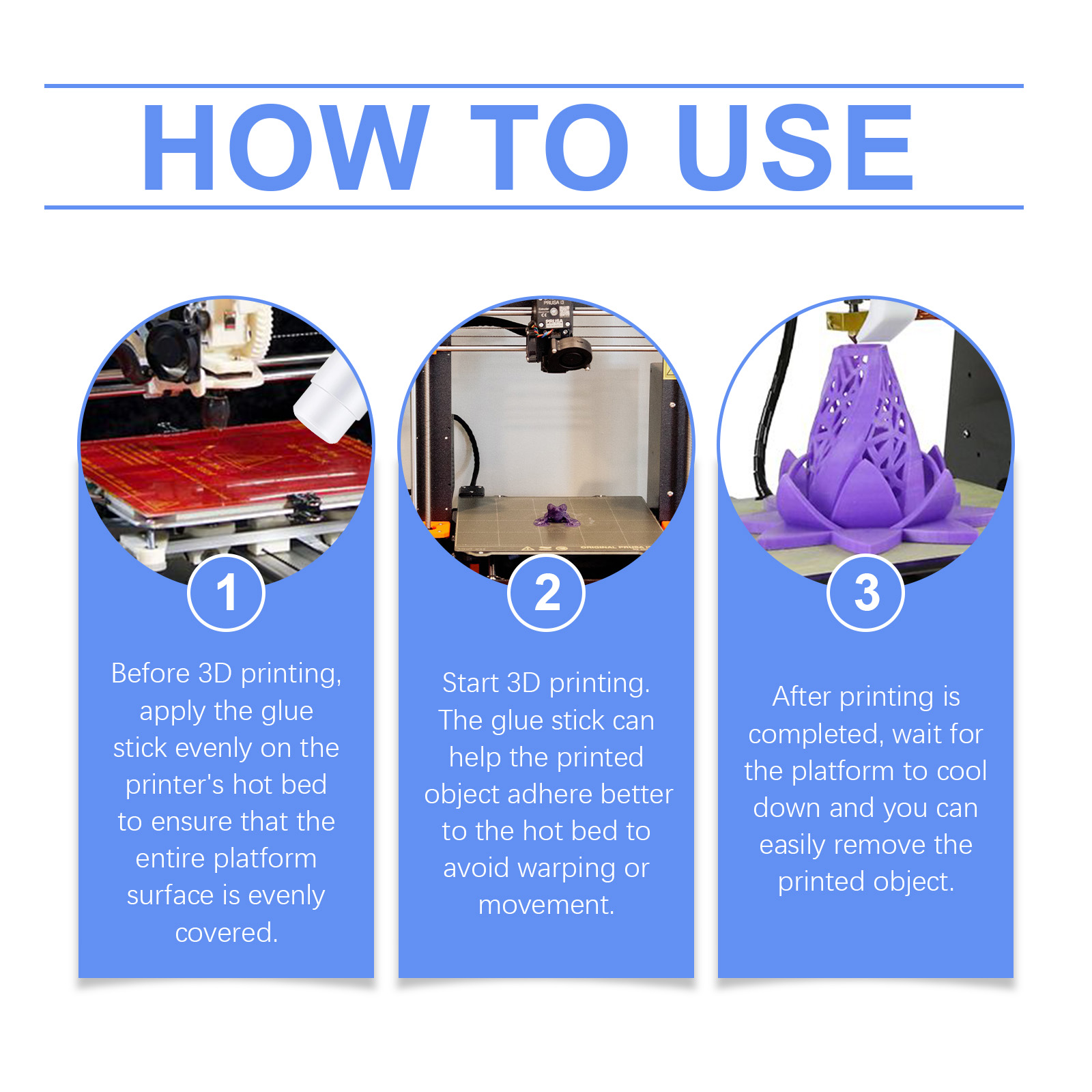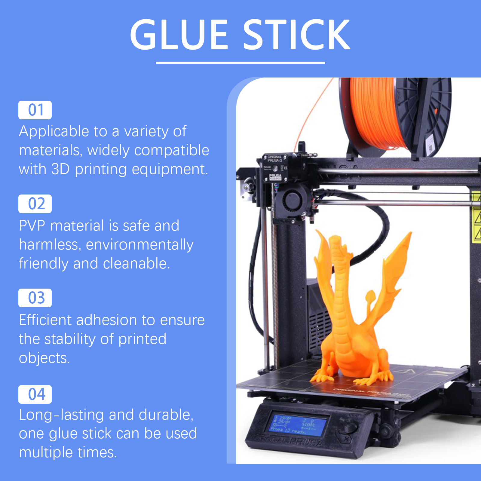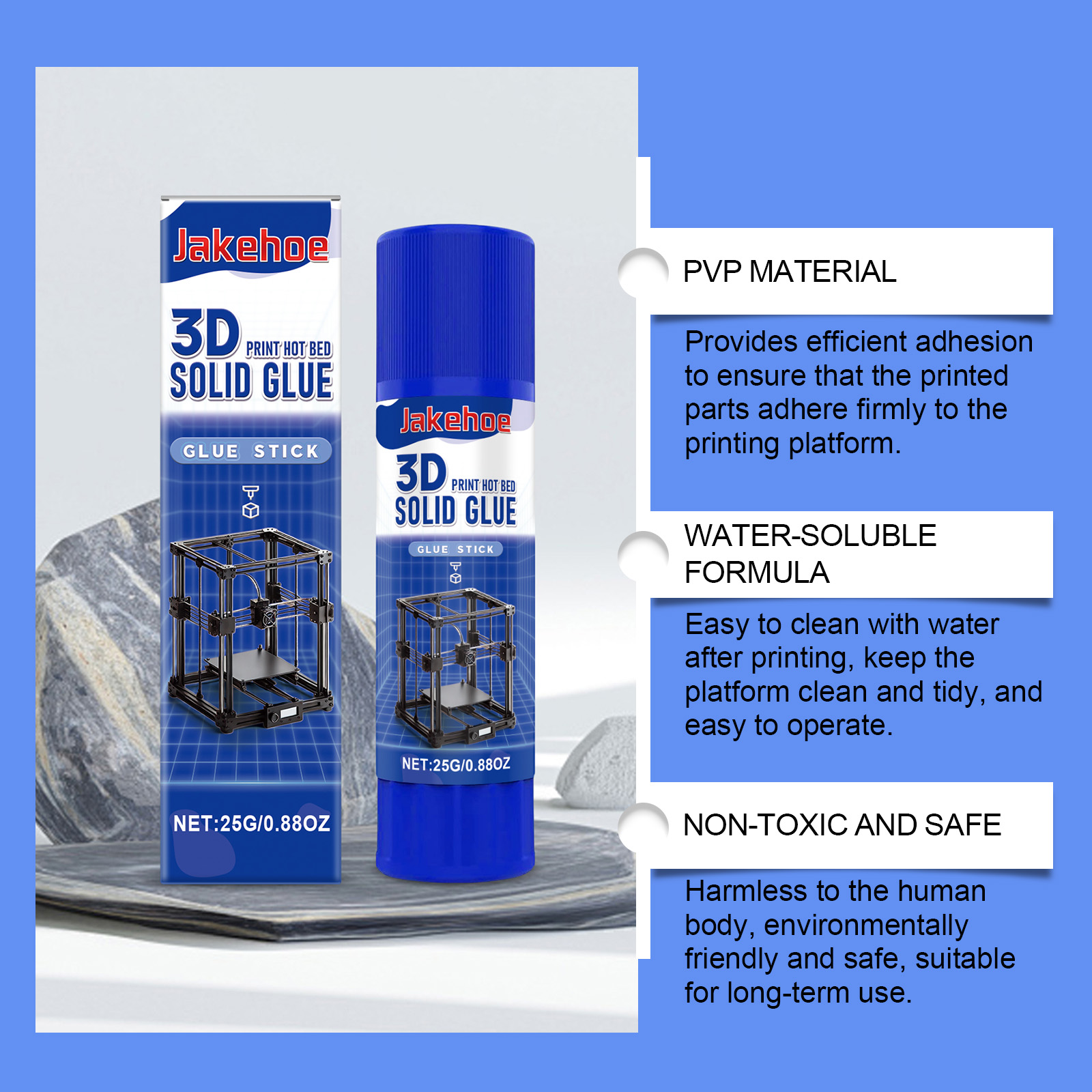 Our printer glue sticks contain PVP. It provides efficient bonding, ensuring that printed parts adhere firmly to the printing platform. Easy to clean with water after printing, keep the platform clean and tidy, easy to operate. How to use it is simple: 1. Before 3D printing! Apply the glue stick evenly to the hot bed of the printer to ensure that the entire platform surface is evenly covered. 2. Start 3D printing. Glue sticks can help print objects adhere better to the hot bed and avoid warping or moving. 3. After printing, wait for the platform to cool and you can easily remove the printed object. The water-soluble formula makes it very easy to use and clean. The print material can be easily removed after cooling, ensuring a simple and smooth printing experience.