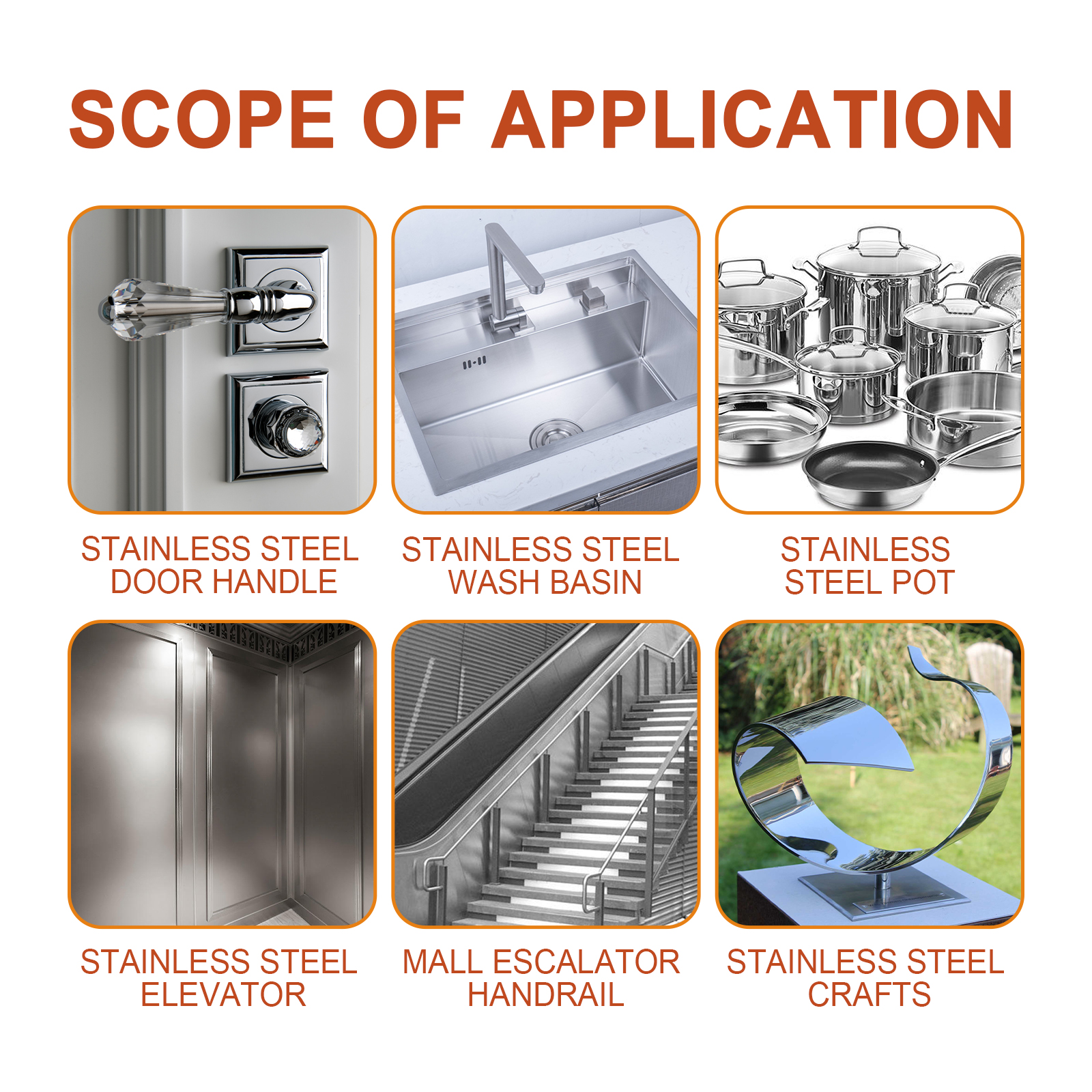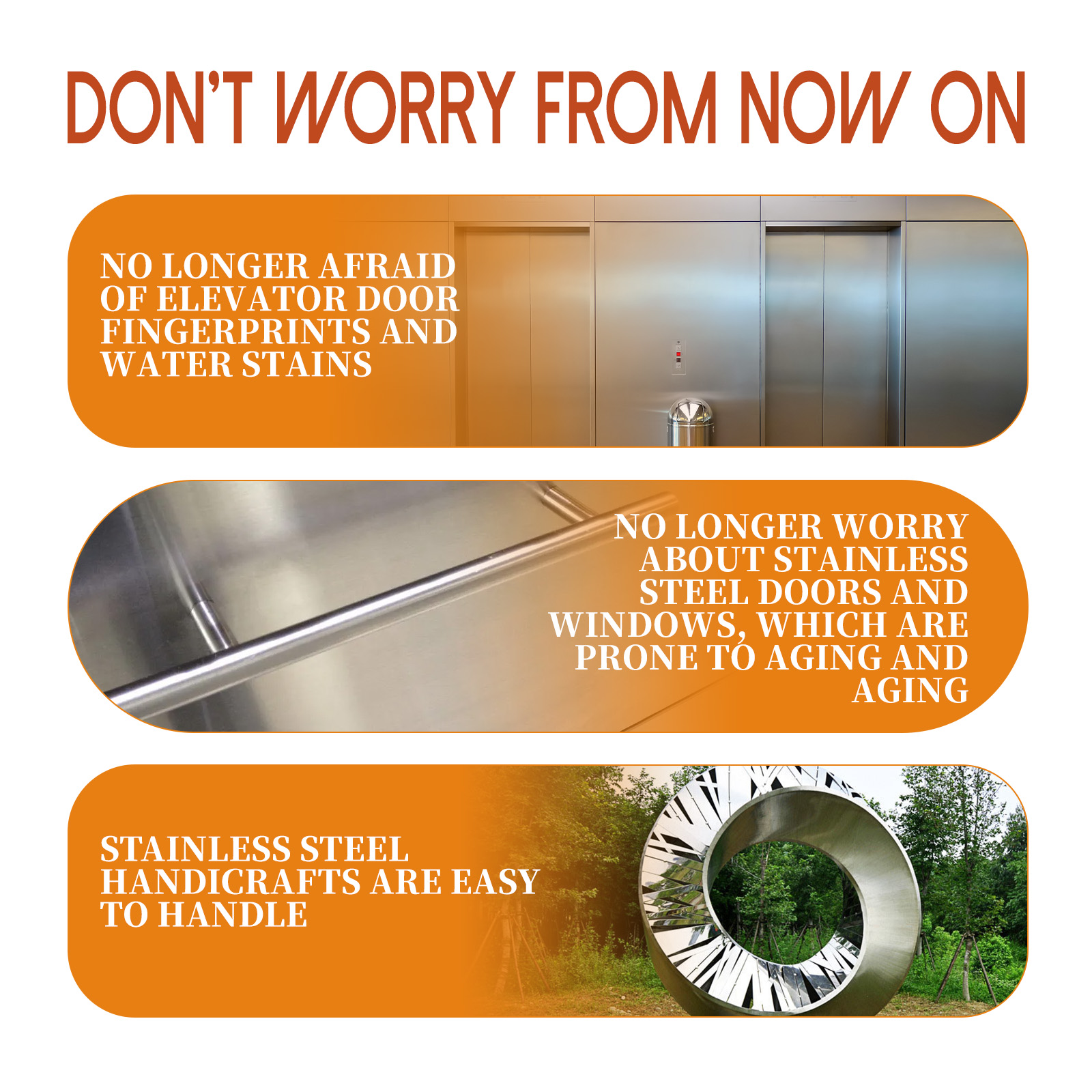 Our stainless steel maintenance agent contains deionized water, isoalkyl solvent, triethanolamine. It can quickly remove fingerprints and water stains on the surface of stainless steel, and restore the original luster to the surface of stainless steel. Its use method is very simple: Turn the switch to open the sprayer ; Spray the spray evenly on the stainless steel surface ; Wipe and polish with a dry towel. Stainless steel maintenance agent can form a protective film on the surface of stainless steel to maintain the surface and extend the service life of the item; It is easy and fast to use. Simply spray and wipe to add shine to the item and make it easy to maintain without damaging the surface or leaving marks during cleaning.