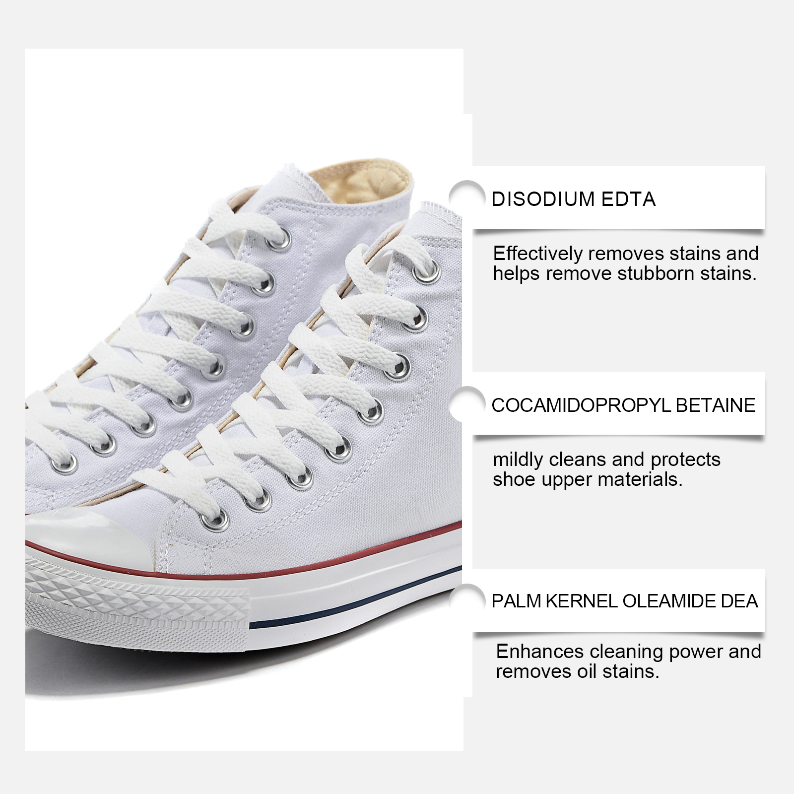 Our white shoe foam cleaner contains disodium EDTA, cocamidopropyl betaine, palm kernel oil amide DEA. It can effectively remove dirt, oil and stubborn stains, and give your white shoe covers a new look. Its use method is very simple: 1. Press the appropriate amount of detergent to make the foam evenly cover the upper; 2. Gently scrub the upper with a soft brush to dissolve the stain completely. 3. Wipe the upper with a dry towel until it is clean. Remove stubborn stains effectively and restore the upper as clean as new.
