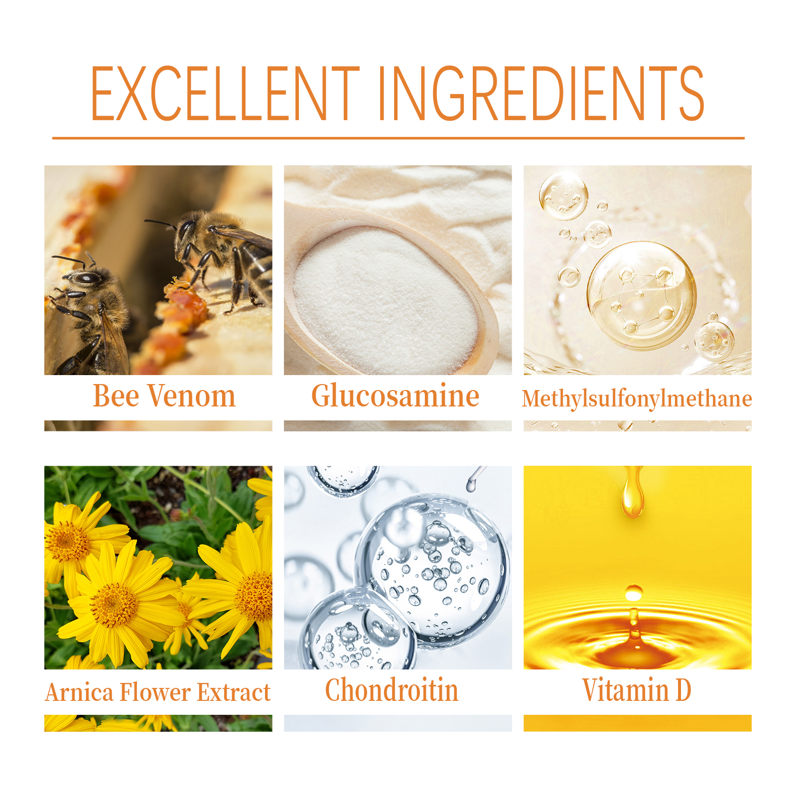 Our Beease Arthritis Spray contains bee venom, glucosamine, methyl sulfonyl methane. It can relieve bone and joint pain, eliminate inflammation, promote joint tissue repair, promote blood circulation, and improve joint flexibility. Its use method is very simple: clean and dry the skin of the joint, spray on the joint skin evenly 2-3 times, and gently massage with the hand in a circular motion until absorbed. Relieve arthritis pain, eliminate cysts and edema, and promote joint tissue repair.