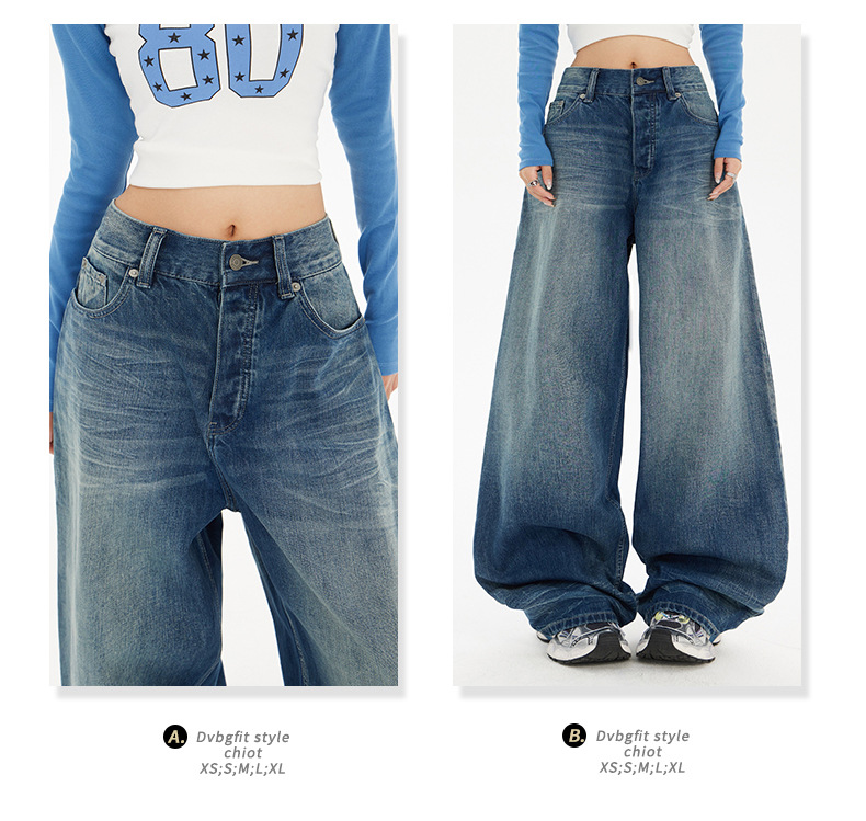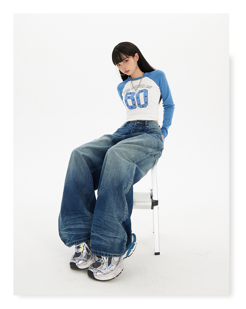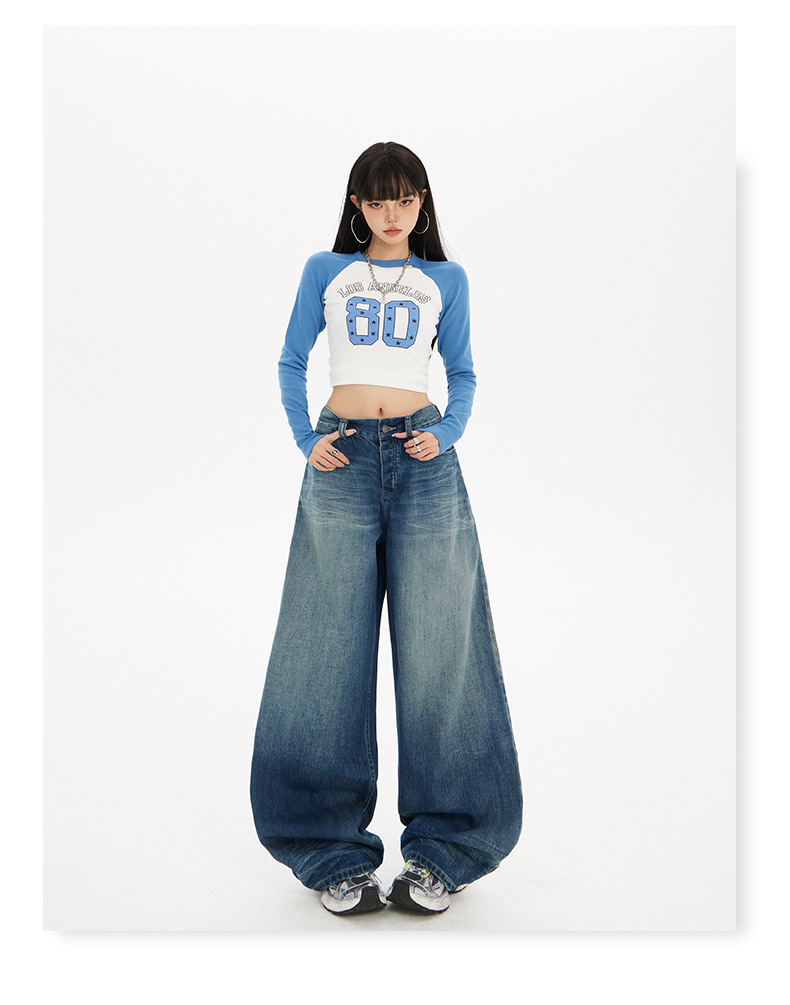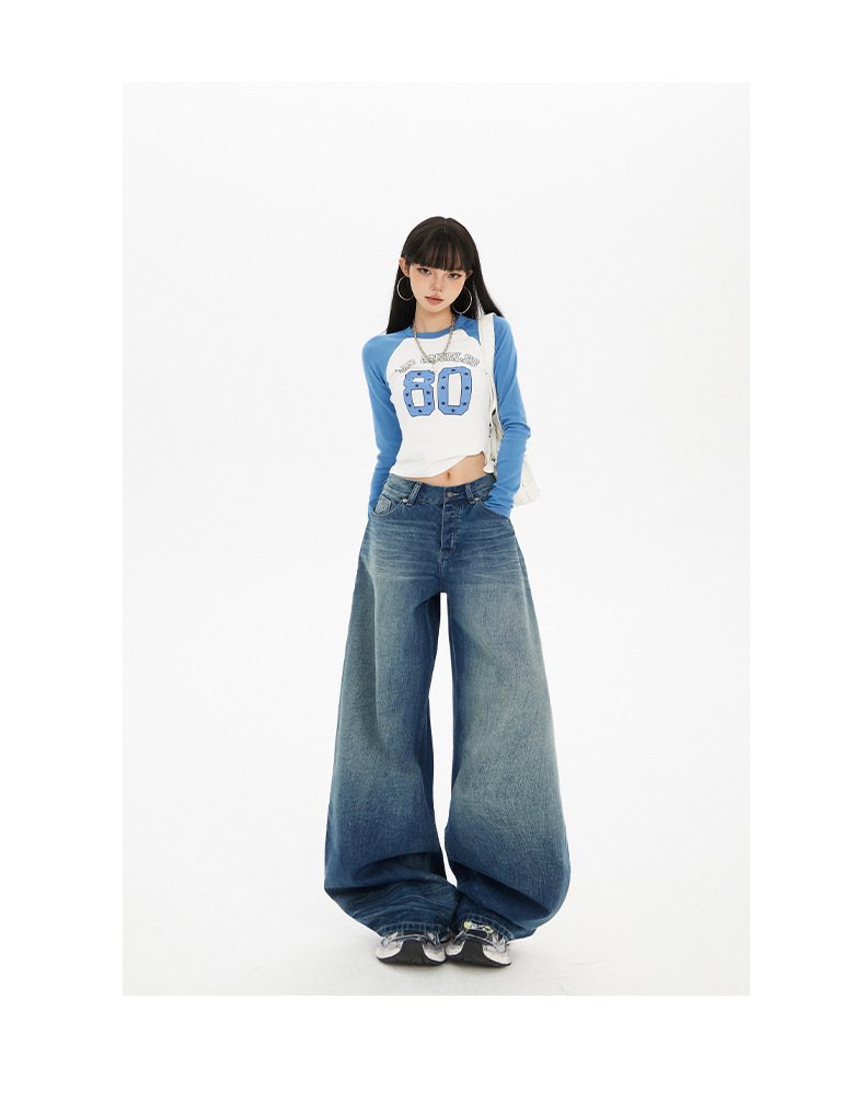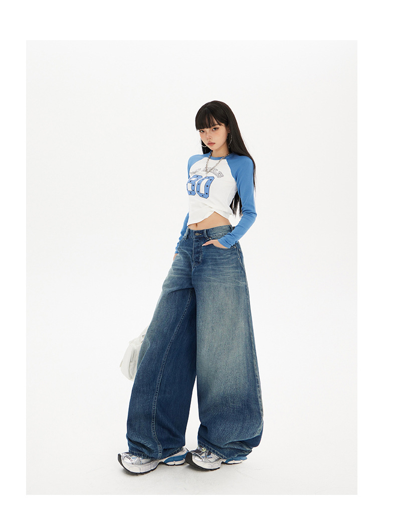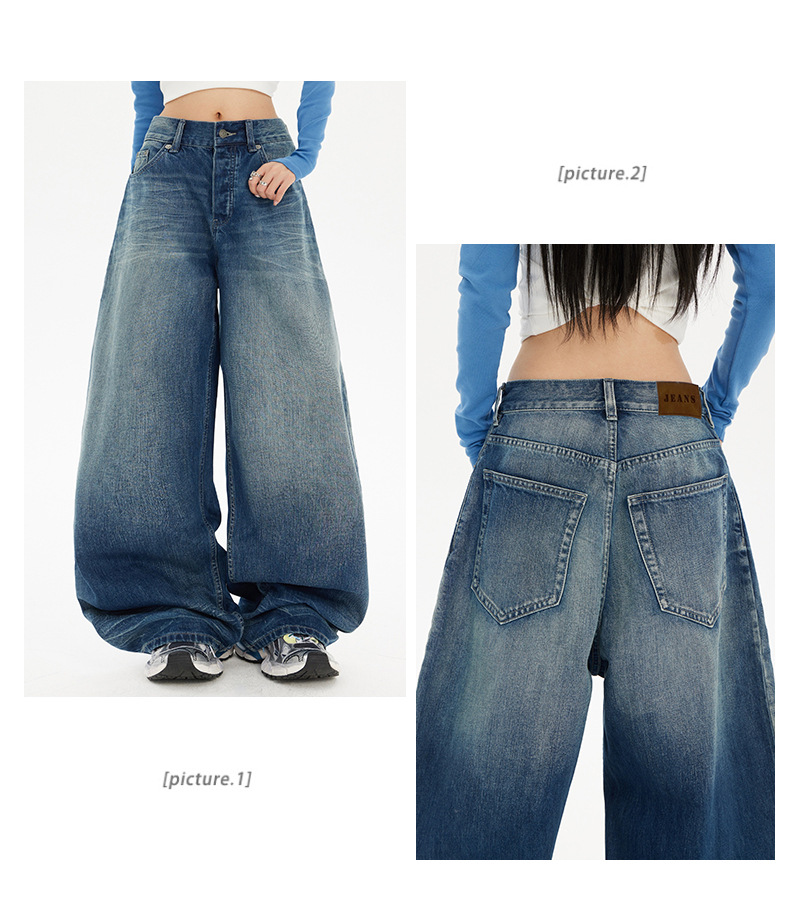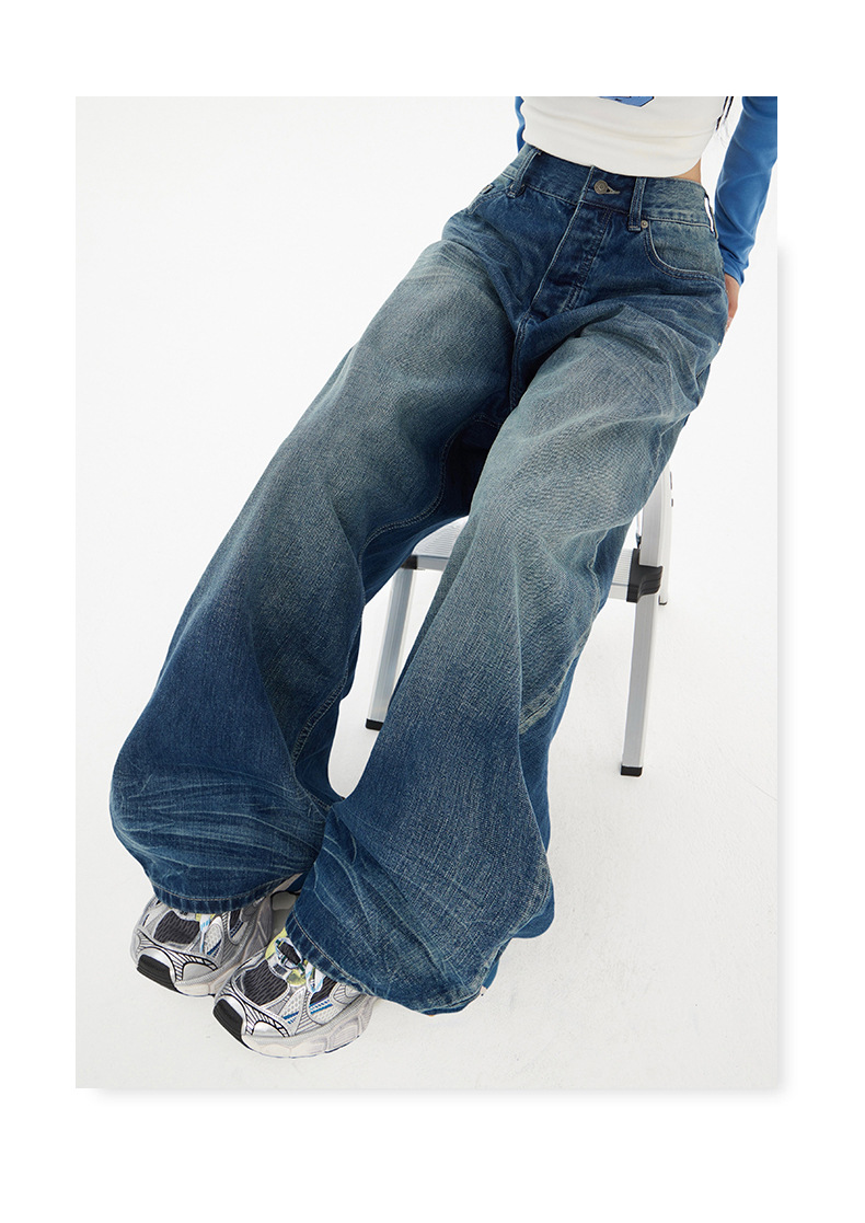 Women’s Blue Knife-Leg Jeans Gradient High-Waist Loose Wide-Leg Pants