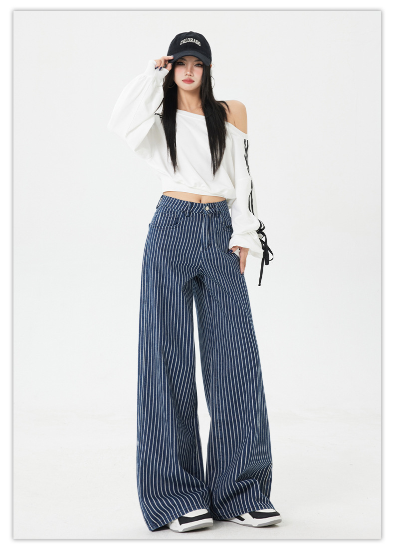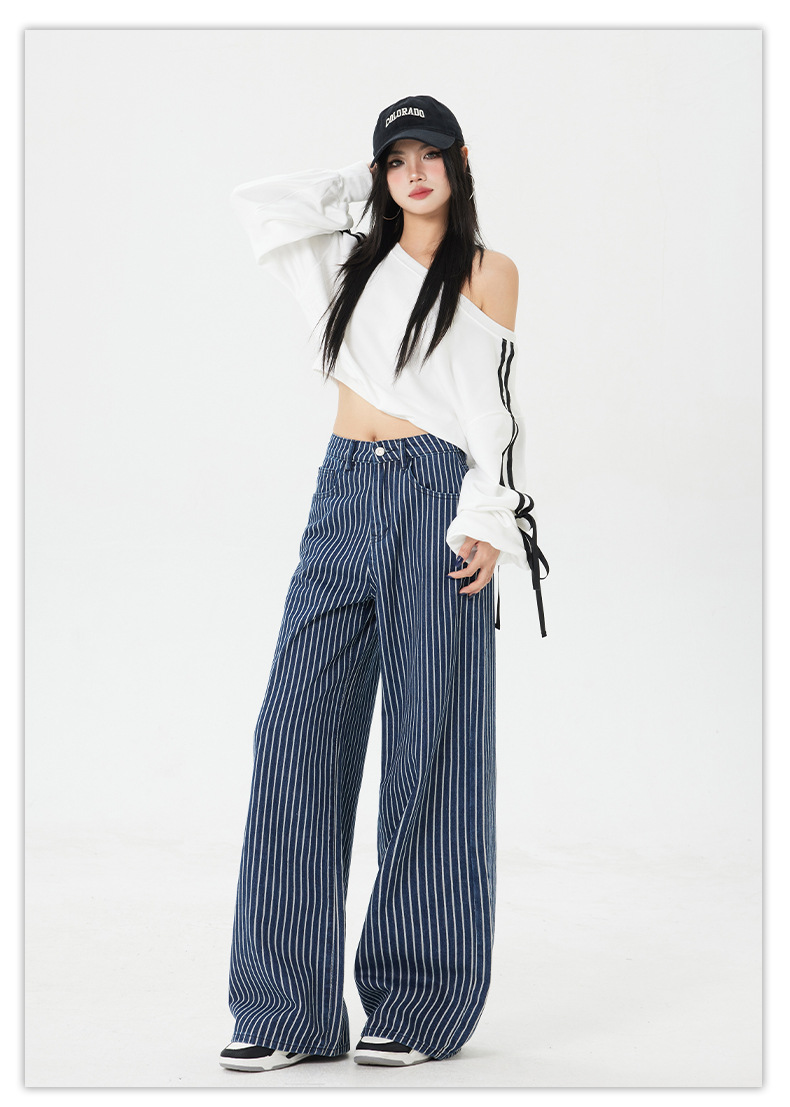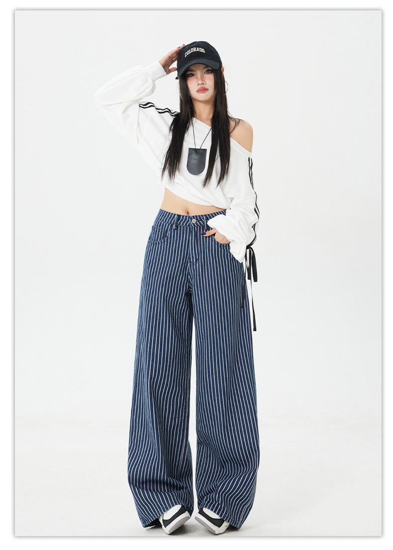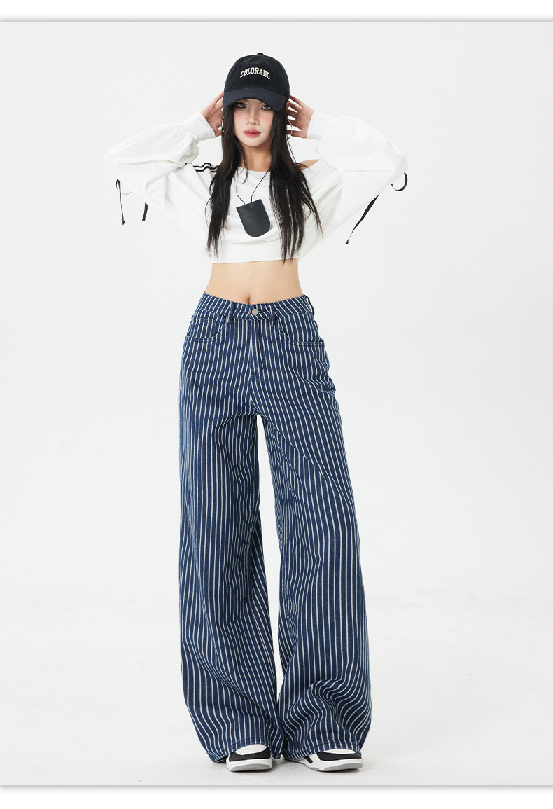 Women’s Dark Blue Striped Wide-Leg Jeans Loose Casual Straight Floor-Length Pants
