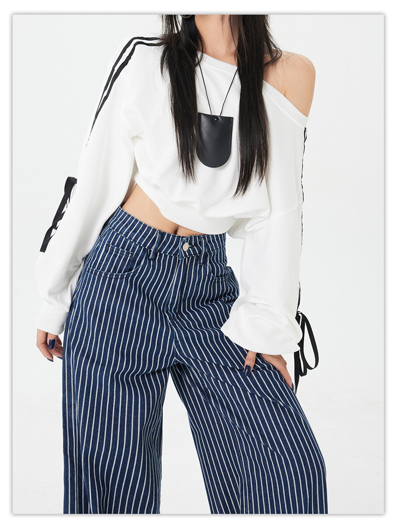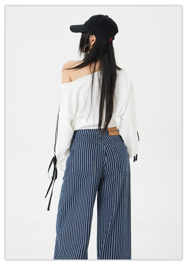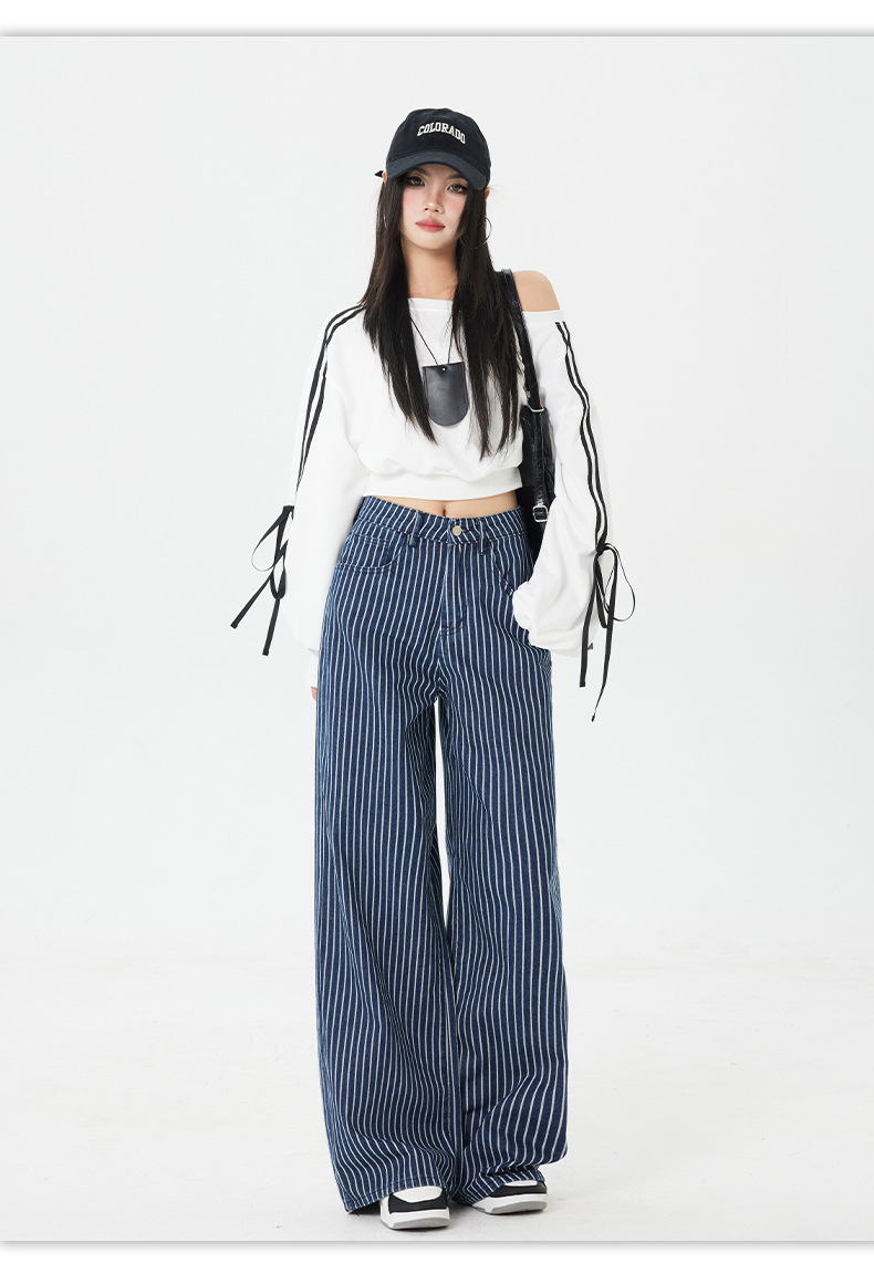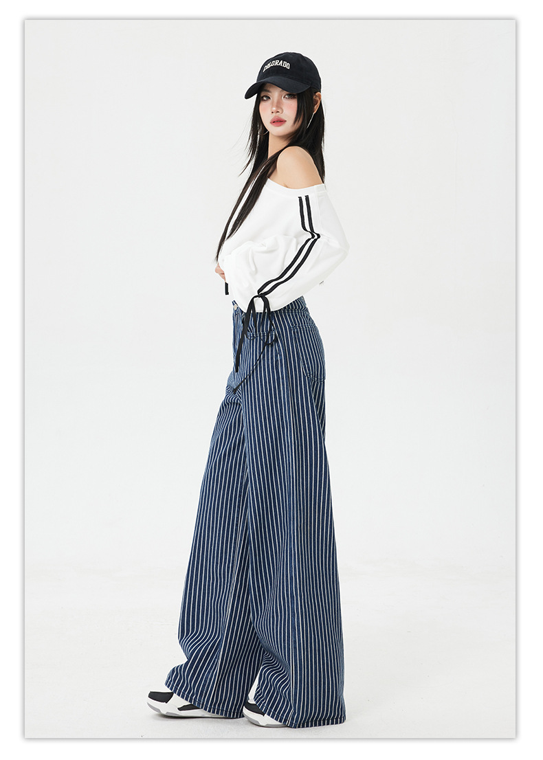 Women’s Dark Blue Striped Wide-Leg Jeans Loose Casual Straight Floor-Length Pants